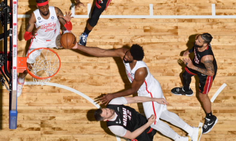 第一节,哈登错位对上阿德巴约,他传球助攻恩比德命中三分球。随后又是哈登和恩比德的连线,后者双手暴扣。哈登长传前场找到快下哈里斯,76人反击得分。哈登投篮手感一般,同时面对巴特勒的防守还被吹走步。哈登滑翔上篮造成斯特鲁斯犯规,他两罚全中。首节哈登的传球感觉不错,但投篮糟糕,76人落后10分。