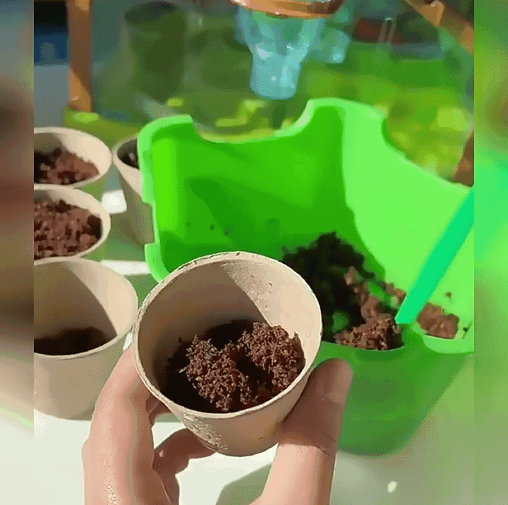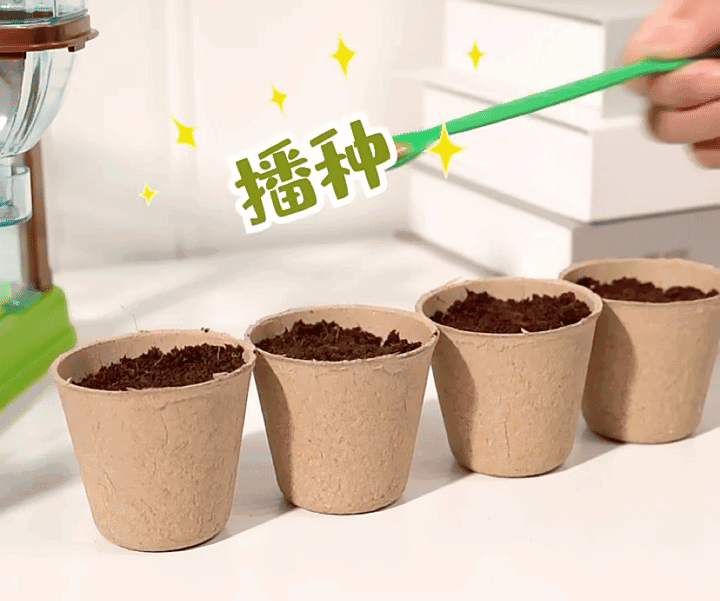 选用可降解花盆,移栽不换盆对环境超友好,像是客厅、卧室、阳台、院子等等皆可种,将泡发好的营养土装进花盆中。