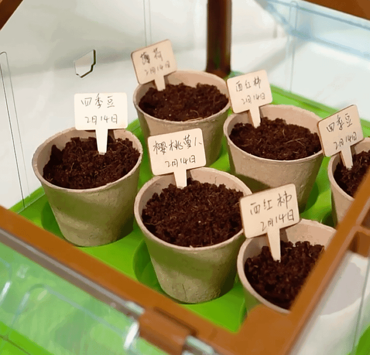 撒上种子后,我们担心分不清种类,于是把每个品种都用卡牌标注了出来。