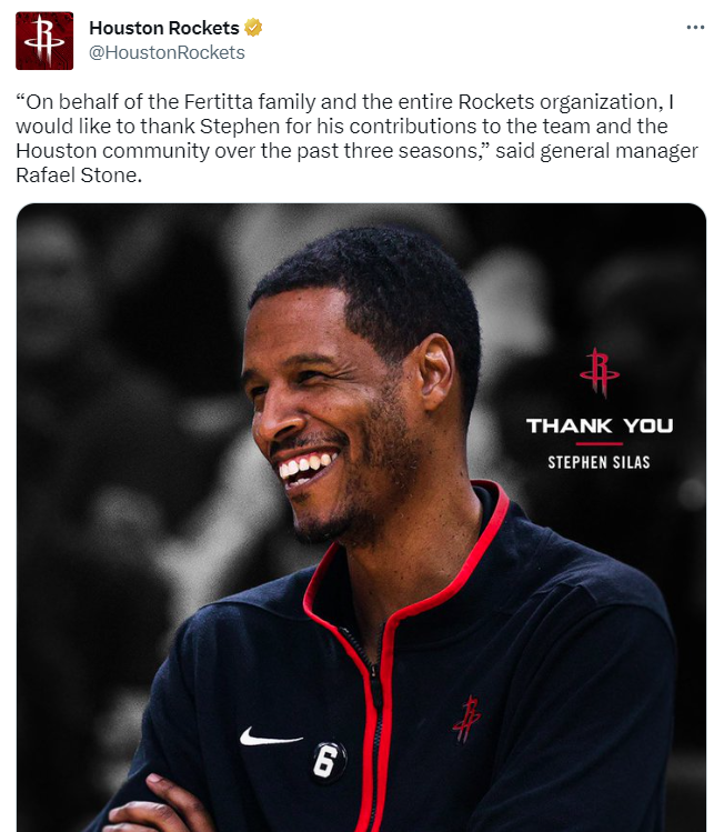 火箭在赛季结束第一时间就被曝出将更换主帅,今天球队正式宣布与效力球队三年的主帅塞拉斯分道扬镳,并且球队举办了季末新闻发布会,球队总经理斯通透露球队休赛期全盘计划,直言任何交易都会考虑,而名记曝出斯通这个夏天压力山大。