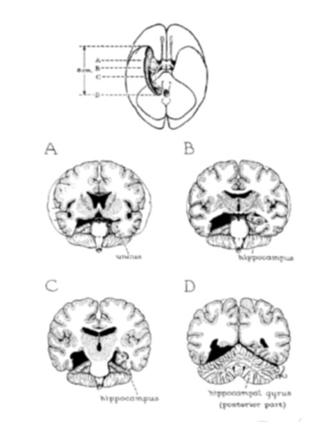 1953 年 8 月 25 日,亨利接受了手术。在术中 EEG 的监控下,尽管没有找到致病灶,威廉还是按照原定计划,用抽吸器小心翼翼地吸出了亨利大脑的内侧颞叶、杏仁核、沟回、内嗅皮层以及海马体。