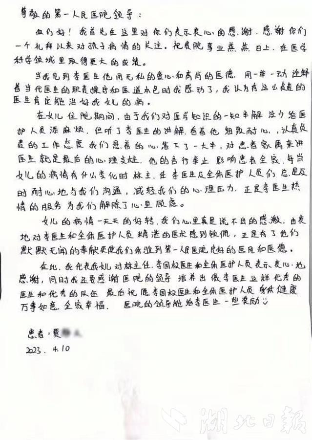 “我们想回黑龙江老家,让雯雯休养一段时间。”雯雯父母对手术效果满意,在即将返回黑龙江之前,送来锦旗和雯雯亲手书写的感谢信,对江夏医务人员表达感激之情和真诚祝愿。