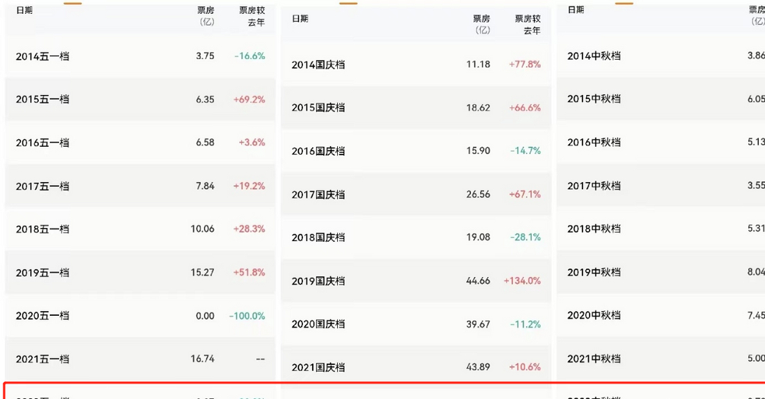 甚至连每一年几乎都会创造票房神话的各种长假,在2022年都仿佛已经失去了魔力,以国庆长假为例,2021年时候,国庆档七天共收获了将近44亿元的票房,但到了2022年的国庆,却只有不到15亿。对于任何一个行业而言,这样的缩水都无疑是巨大的打击。
