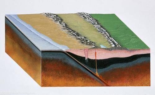 还有一些板块是大洋和大陆板块的交界处,这里多说一句,大陆板块的密度比较小,大洋板块的密度比较大,因此当这两个板块相互靠近时,由于大洋板块较重,因此会俯冲到大陆板块下方,直到融入地幔,所以,这种边界也叫俯冲边界。