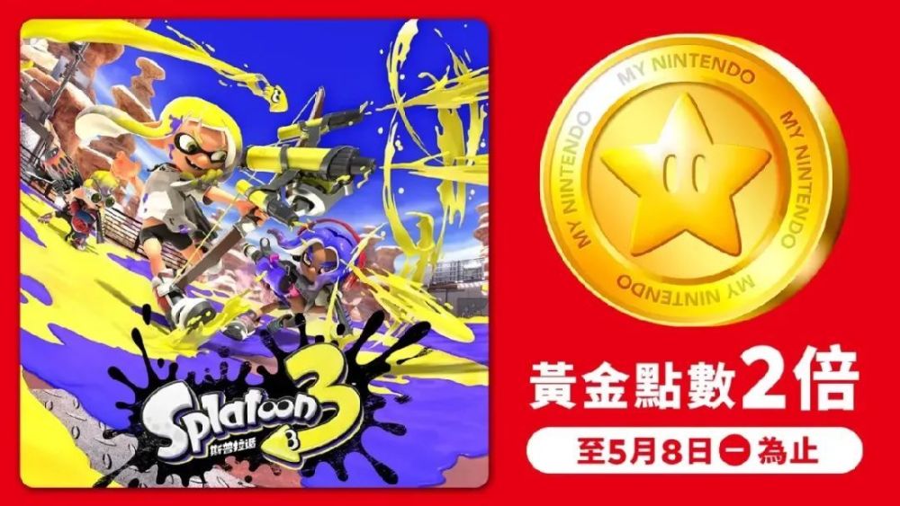 即日起至5月8 日,在港服eShop购买《Splatoon 3》下载版或在网页版商店购买《Splatoon 3》下载码,并完成兑换,即可获得双倍黄金点数。组合商品《Splatoon 3 + 季票组合》也参与该活动。