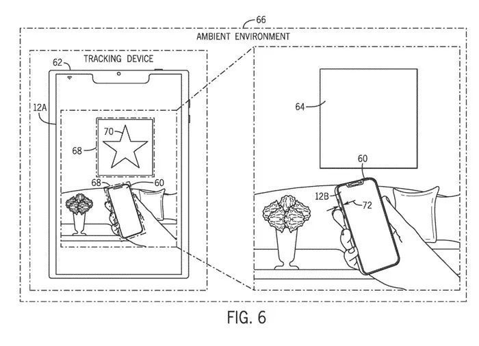 追踪由围绕智能手机和呈现在平板电脑的显示器12A上的对象64的渲染图像的虚线68表示。平板电脑追踪对象64可能比追踪智能手机更容易,因为对象64是静止。