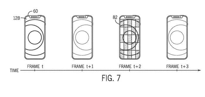 为了详细说明,图7是智能手机随时间通过显示器12B呈现图像帧的示意图。平板电脑可以监视智能手机,以观察指定的追踪数据82出现在周围环境66的捕获图像数据中。指定的追踪数据82可以是水印、图案等。