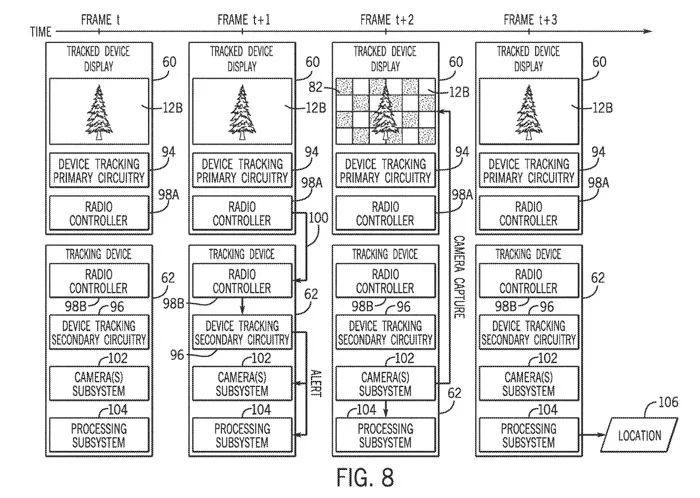 在呈现第三帧(例如“帧t+2”)的第三时间,平板电脑操作摄像头子系统102以捕获显示器12B、智能手机和/或周围环境66的图像数据。因此,摄像头子系统102可以在智能手机显示指定的追踪数据82时捕获被追踪设备的图像。