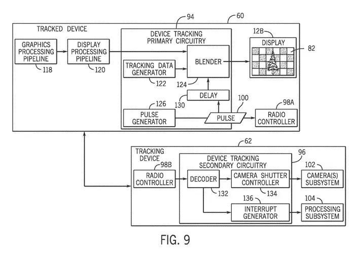 除了图8中描述的模块之外,平板电脑同时可以包括脉冲解码器132、摄像头快门控制器134和中断生成器136,作为设备追踪次级电路96的一部分。