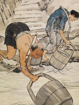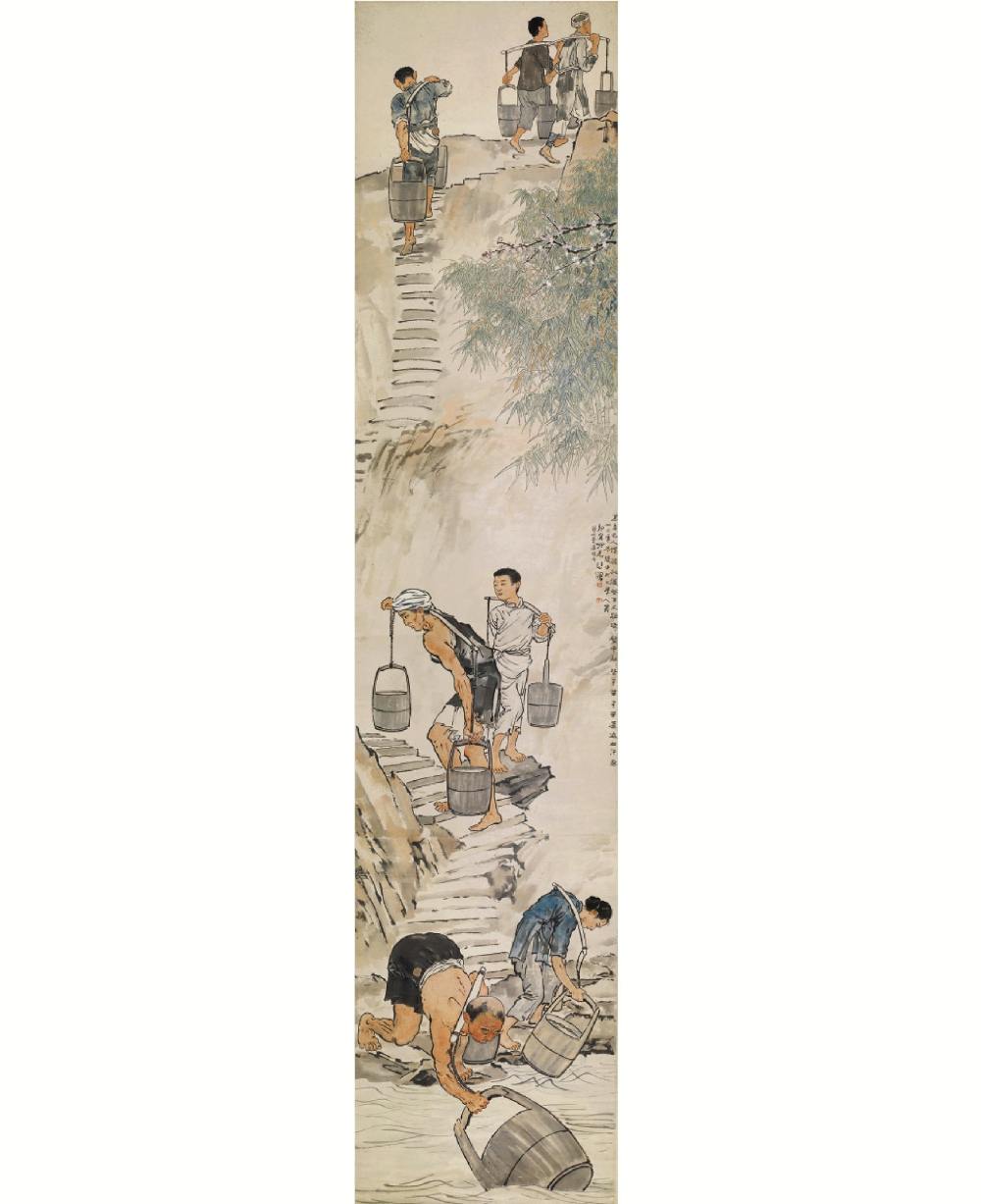 其中,《巴人汲水图》更是被誉为徐悲鸿最具人民性和时代精神的代表作。画家以其高度概括的手法,将巴人传统汲水的宏大场面分解为舀水、让路、登高前行3个段落,精心绘制了多幅草稿,描绘了男女老幼共7个人物。画面最下方的男子,仅穿着一条黑色短裤,匍匐着前身,右手紧握着一只巨大的木桶提梁,从湍急的嘉陵江水中,迅捷而熟练地舀水。旁边一衣着褴缕的赤足妇女,正把舀满的水桶吃力地提到岸边。在中景上一位头缠汗巾、赤臂裸腿的男子,弓着身体,肩负着重担,努力地攀登着陡立而漫漫的石梯。与他呼应的是一位身穿长衫,把前摆挽在腰间,肩挑空担的青年男子,他正身体微侧,谦恭地站立在路边的一块石头上,以同情与怜悯的目光凝视着吃力攀登的挑夫。图画的上方,绘制了3位已攀至江岸顶端的挑夫,他们爬完了艰险的陡梯,开始迈开大步,比较轻松地急行。画面段落之间,由江岸的岩石和层层的石阶连接、贯通,呈 “之”字形排开,使画面错落有致。徐悲鸿有意拉大了第二个画面与第三个画面的距离,为了使江岸的陡峭更为突出。画上的题诗:“忍看巴人惯担挑,汲登百丈路迢迢;盘中粒粒皆辛苦,辛苦还添血汗熬。”诗文更是满含着徐悲鸿对劳动人民的钦敬与同情,这种隽永深长的画外之意,发人深思。