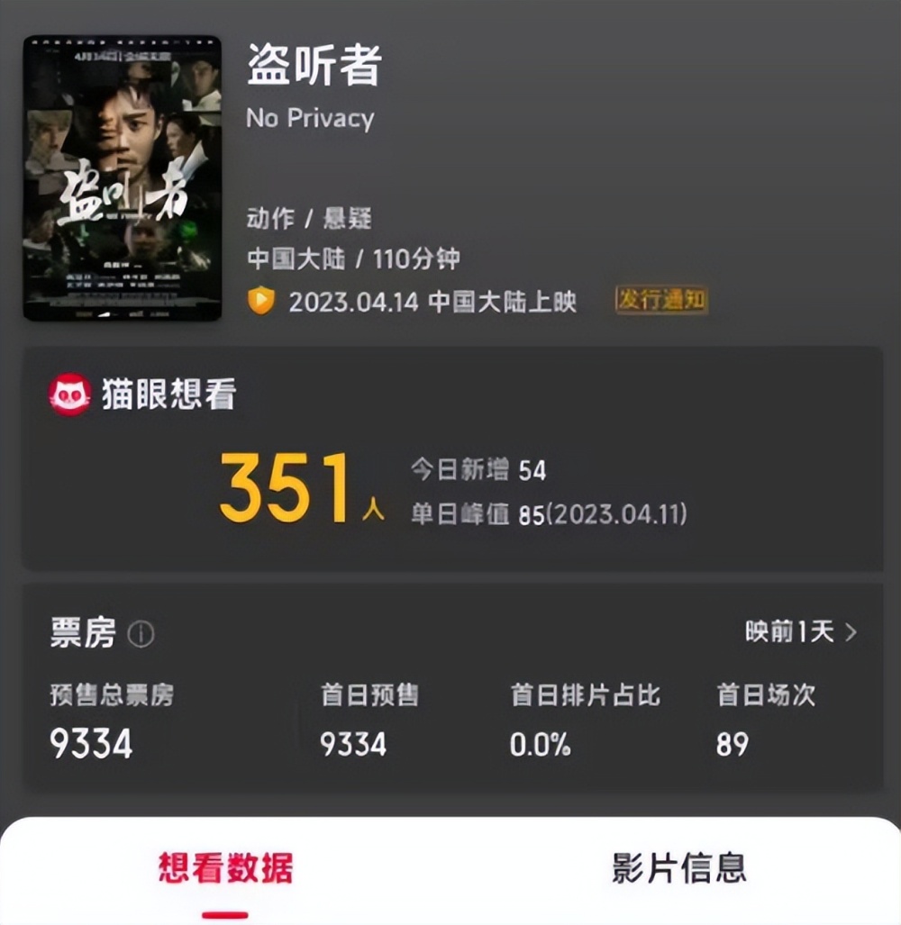 截止4月13号20点,离《盗听者》上映不到1天,电影预售票房仅9334元。电影扑街已经是定局。