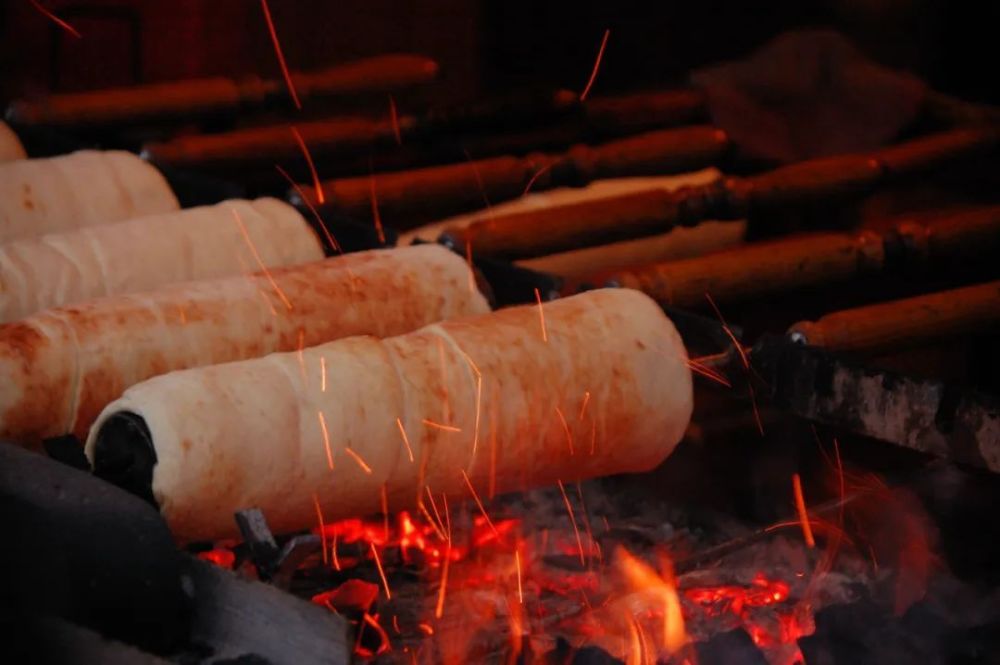 烤叉棍蛋糕,就是在烤叉棍上,通过明火,用类似烤乳猪的方法,将面糊一圈圈地,边转边卷,每熟一层再浇一层面糊,最后从烤叉棍上取下。