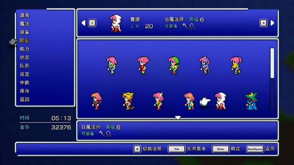 《最终幻想5》SFC版拥有多达21种职业,GBA重制版及之后的版本还增加了4个新职业:死灵术士、预言家、炮击士、剑斗士,最终达到25种之多。各种职业的特性在习得对应技能后都可随意组合,这给玩家们的战略战术带来了惊人的丰富程度。除了传统的战法牧之外,极限输出职业还有狂战和忍者,法爷则被细分为白、黑、青、时、召唤、暗、预言七种,其他辅助控场系的职业也都是老传统了,哪怕随意搭配一下都可以发挥不一样的威力。