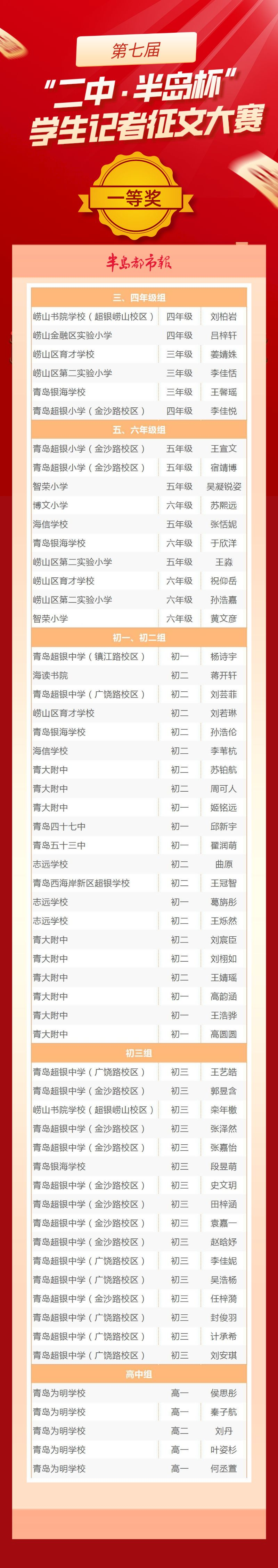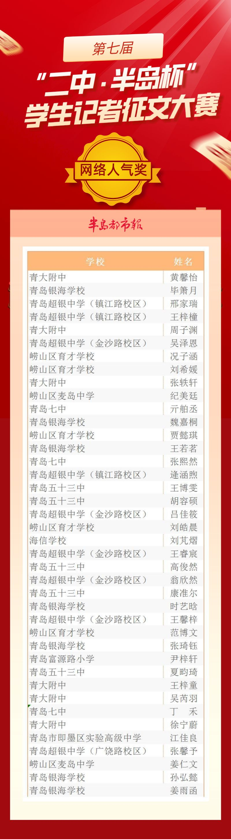 第七届“二中·半岛杯”学生记者征文大赛获奖名单公布了!近日,记者从“二中·半岛杯”组委会获悉,大赛收到1.5万多篇学生作文,由二十多名教学经验丰富的名师和作家协会作家担当评委,经过征稿、初选、盲评等环节,最终敲定了各年龄组别获得一、二、三等奖和网络人气奖共3805名。其中,网络人气奖40名,一等奖58名、二等奖1374名、三等奖2286名。