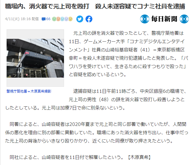 据日本媒体 每日新闻 报道,4 月 11 日,东京警方以涉嫌杀人未遂罪逮捕 41 岁的科乐美员工山崎裕基,当天上午 11 时许,山崎在办公室用灭火器从背后袭击正在工作 48 岁的前上司,后者被送医后暂时没有生命危险。