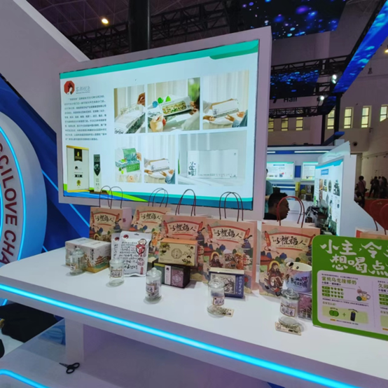 据展台工作人员介绍,茶颜悦色这次带来的展品包括“可以还原门店80分的自摇沫泡奶茶、幽兰拿铁上的同款碧根果、体现湖南特色的弗兰茶3.0等,这些产品在我们的官方天猫店有售,扫码下单,直接送货到家。”
