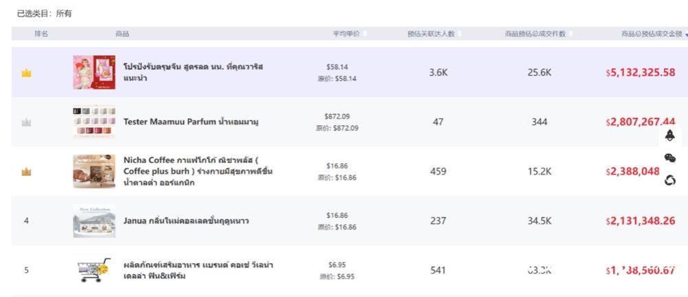在泰国TikTok电商热销商品中,近30天内,排名榜首的是一款和中国新年相关的补品,平均单价为58.14美元,预估成交件数为2.6万件,预估销售额约为513.2万美元。