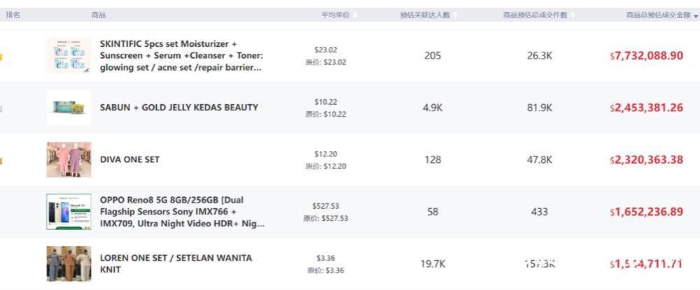 在各国的TikTok电商热销商品中,也出现了中国商品的身影。近30日内,在印尼TikTok电商销售额最高的产品中,OPPO Reno8手机排第四,预估成交量为433件,单价为527.53美元,预估销售额为165.2万美元。