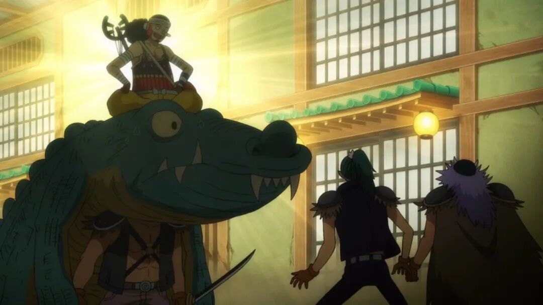 这段情节还算有趣,和原作稍有不同。原作里没有交代前因,直接就是乌索普骑着鳄鱼人,“释放霸王色”降伏杂兵。直观上感受,原作鳄鱼人吃了团子,动画鳄鱼人没吃,是被霸王色巡抚的。不过我不太喜欢娜美卖队友这段情节,虽说是搞笑还是抹黑了娜美。