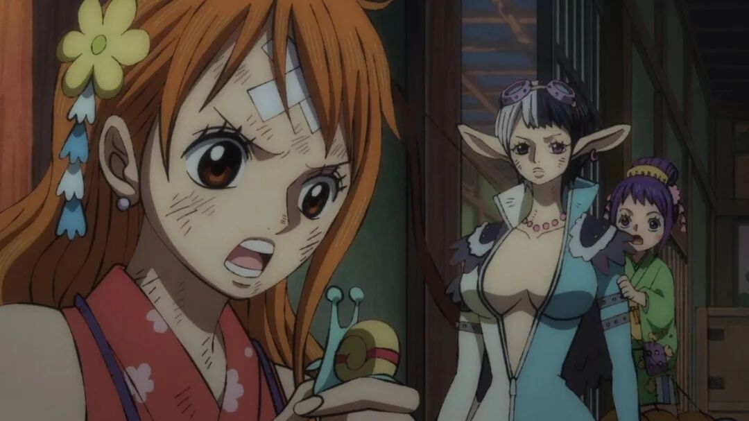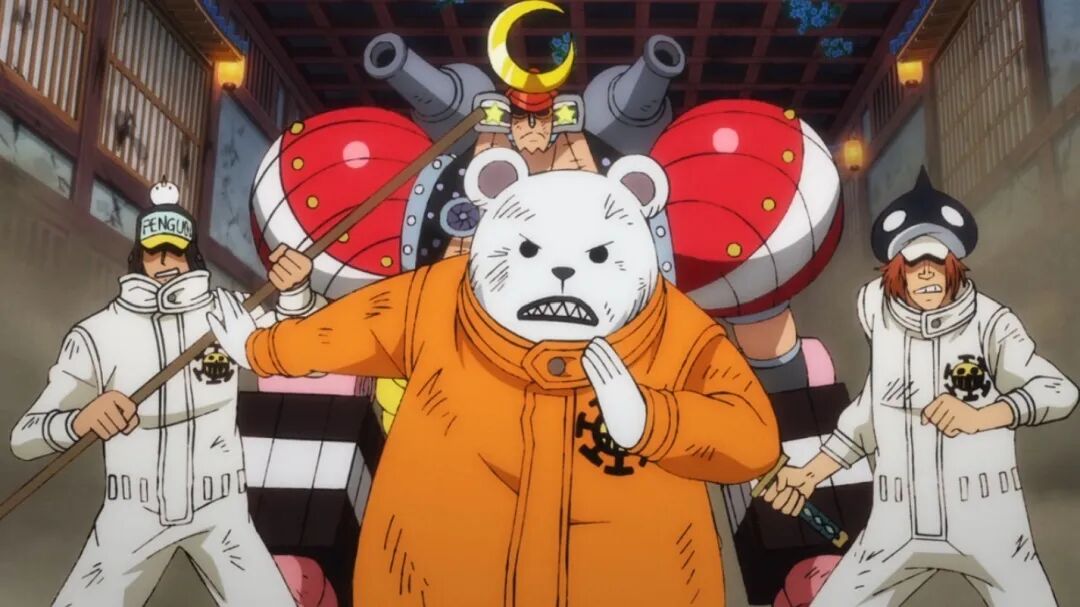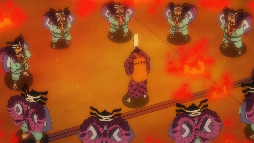 甚平与希特会合。原作中基德团大杀四方,动画出于经费考虑,只让喷火男希特出场(只用请一个声优),还吃瘪被甚平救了。甚平好奇是谁拖住了凯多?看来按照原计划,甚平是打算自己顶上的。