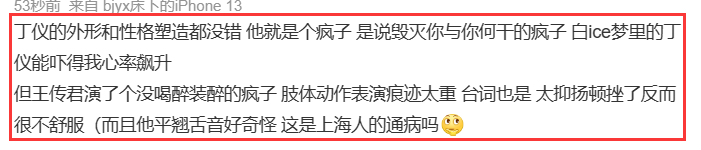 不仅如此,王传君的台词也有一些问题。有观众觉得他从肢体语言到台词,都有点表演痕迹过重的感觉。