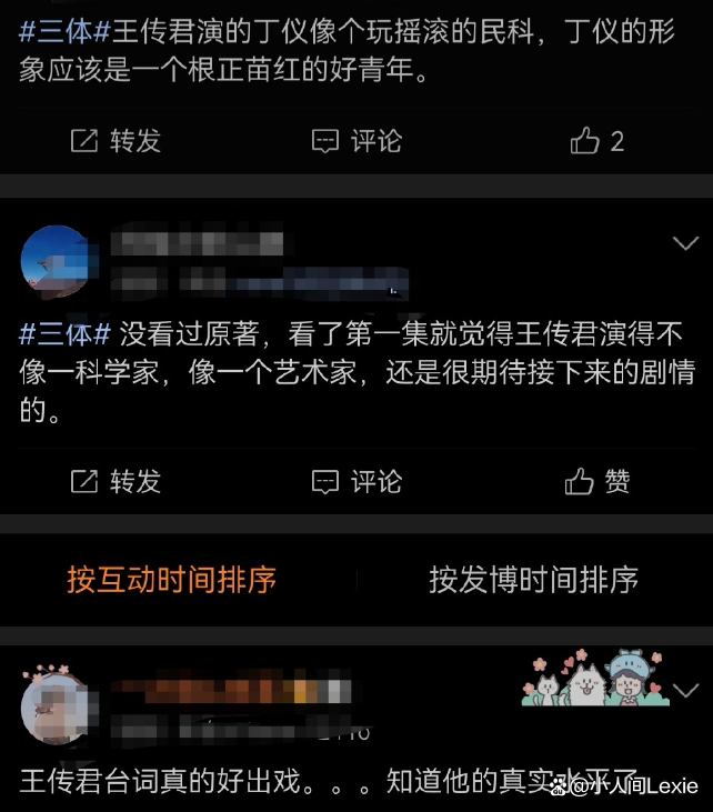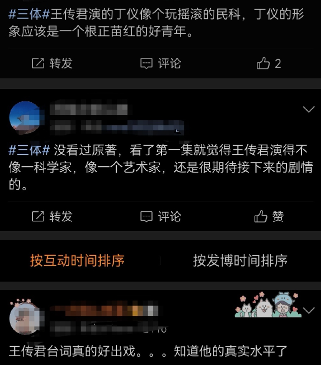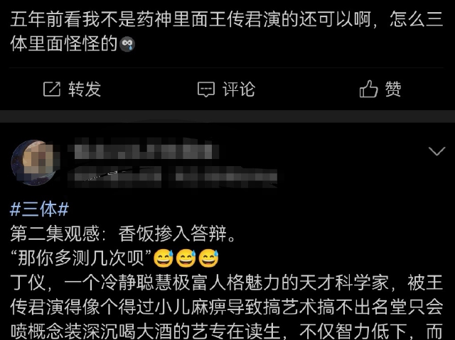 “王传君演的丁仪像个玩摇滚的民科,丁仪的形象应该是一个根正苗红的好青年。”很多观众都在评论里提到,他演的更像一个艺术家,跟科学家不太沾边。