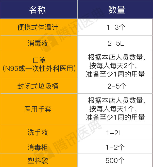 包括但不限于:一次性普通医用口罩或N95口罩(一次性普通口罩、一次性医用口罩或N95口罩)、红外线测温仪、一次性手套、消毒湿巾或免洗手消毒剂(70%以上乙醇含量)、(医用消毒水/酒精/含氯消毒剂 取消)等防护用品。可参考下表。
