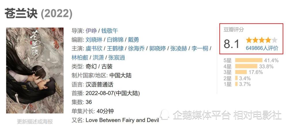 该剧首播于2022年8月暑期档,期间不仅热度与话题讨论度,持续走高,最终口碑,也是霸气达到了豆瓣8.1分。堪称近年来,继2019年《宸汐缘》(张震、倪妮领衔主演)后,又一部豆瓣超过8分的国产仙侠剧公认佳作。