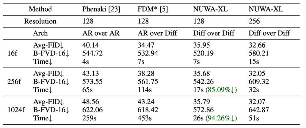 表1:NUWA-XL 长视频生成与最先进模型的定量比较(其中 Avg FID 数值越小代表性能越好)