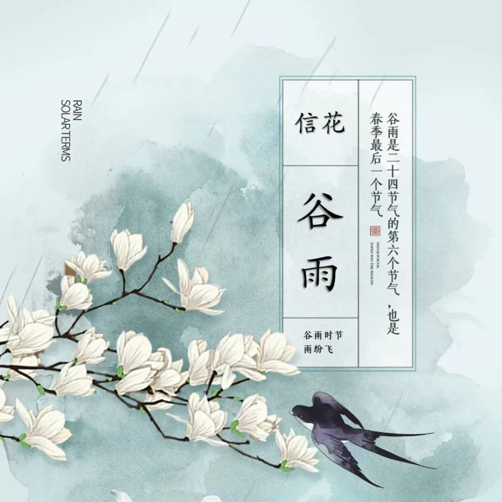 春将尽,夏将至。谷雨是春季最后一个节气。谷雨时节气温升高加快,降雨量增加。春雨绵绵是谷雨最主要的特点,此时田中的秧苗初插、作物新种,最需要雨水的滋润,降雨量充足而及时,谷类作物能茁壮成长。