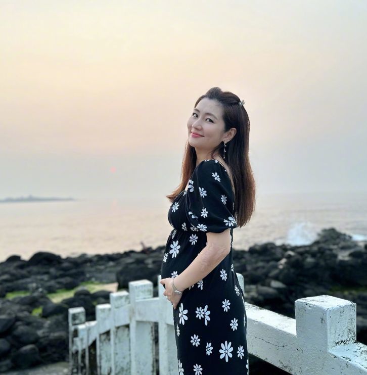 照片中,Selina身穿黑色印花连衣裙,一头长发披肩,怀孕不到五个月,Selina的肚子已经超过了常人,她单手摸着孕肚,露出幸福的笑容。