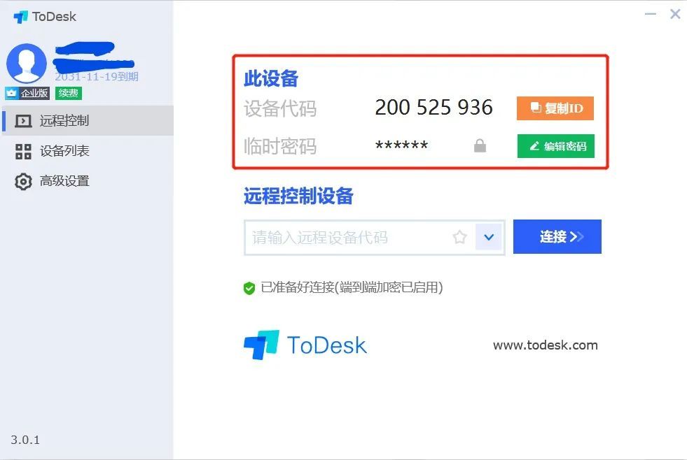 ToDesk界面简单明了,点击电脑设备代码旁边的「复制ID」,然后将代码和密码输入到主控电脑的ToDesk软件中,即可随时控制被控电脑。支持高清分辨率传输画面,实际测试连接操作确实非常流畅方便。