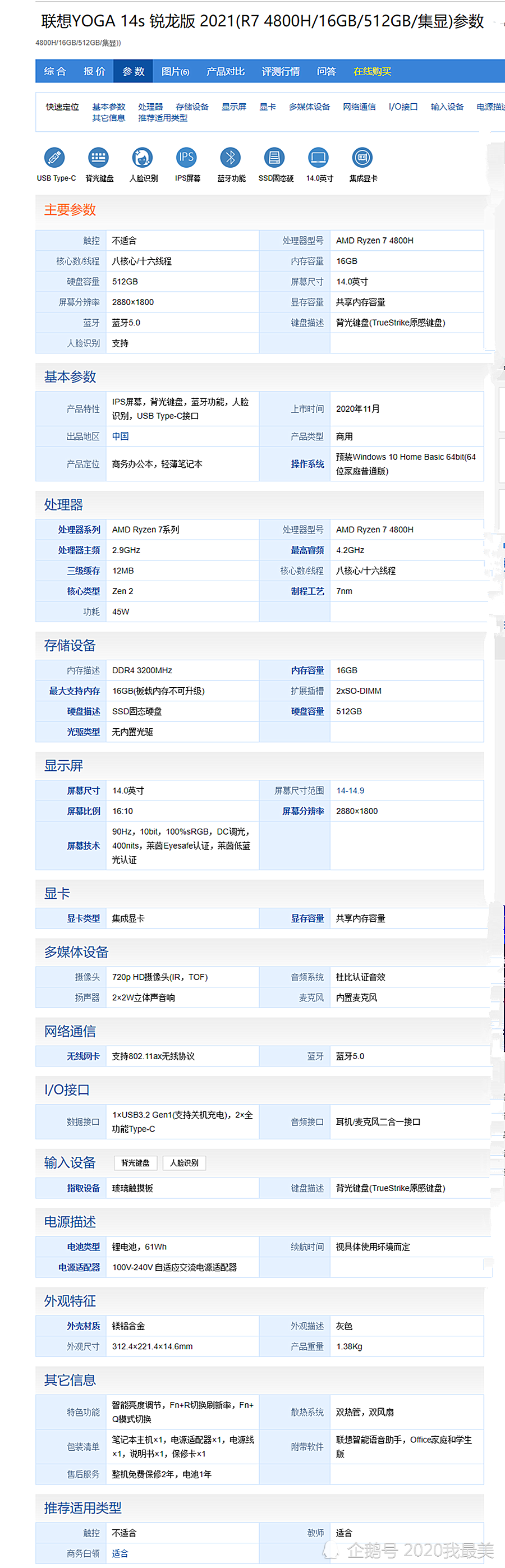 联想yoga 14s 2021搭载AMD的八核十六线程处理器R7-4800H,显卡为核显。其主要优势是搭配一块刷新率90HZ的屏幕,高达2.8k的分辨率(2880*1800),100%sRGB高色域。性能释放非常讯速,很受年轻人喜欢,产品一推出就成了2020年热度很高的一款笔记本电脑之一。