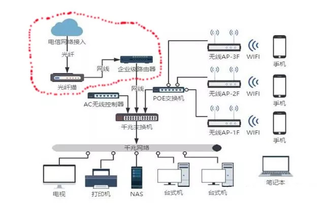 在上面基础上,网络进一步复杂主要是光猫/猫之后的增加网络设备来级联,让更多的设备可以同时有线/无线的方式来同时上网。