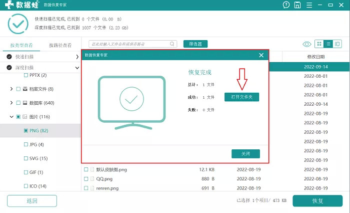 恢复完成后,在出现的小窗口中点击“打开文件夹”就可以看到恢复完成后的文件了。