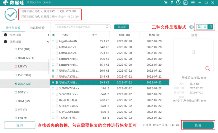 如果回收站没有找到怎么办?可以通过第三方数据恢复工具—数据蛙数据恢复专家找回,扫描、预览、恢复三个步骤即可完成。