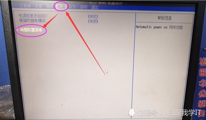 选择‘电源’这一项主菜单(因为定时启动也是属于电源管理这个类目下面的功能,如果是英文菜单,大家找Power这一项),然后是进去下面的‘唤醒配置菜单’(BIOS界面,有的支持鼠标操作,有的不支持鼠标操作,那就用键盘的,,,,操作选择,回车键确认):