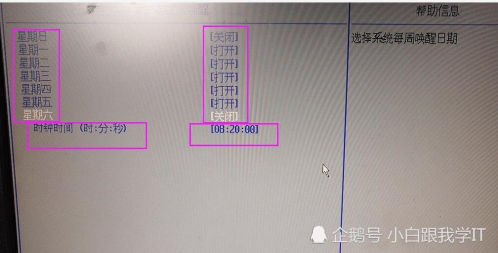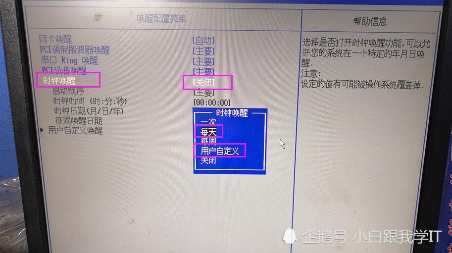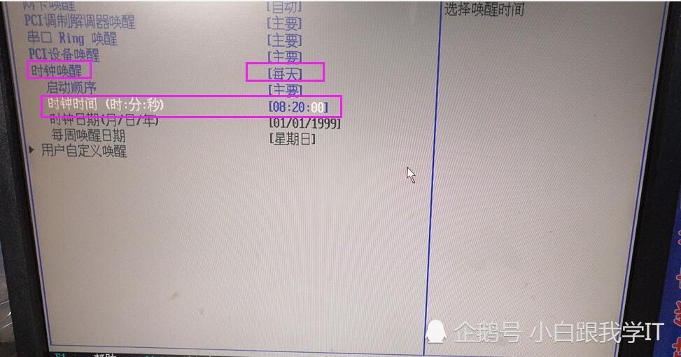 进入之后,上面几项不管它,跟我们这篇文章没关系,就看‘时钟唤醒’这项,这一项的后面是‘关闭’说明主板默认是关闭该功能的,选择这一项并回车,出现唤醒的工作模式选择(比如‘每天’就是说每天执行一次,‘每周’呢,就是一周执行一次,我们需要每天都定时开机,就选‘每天’):