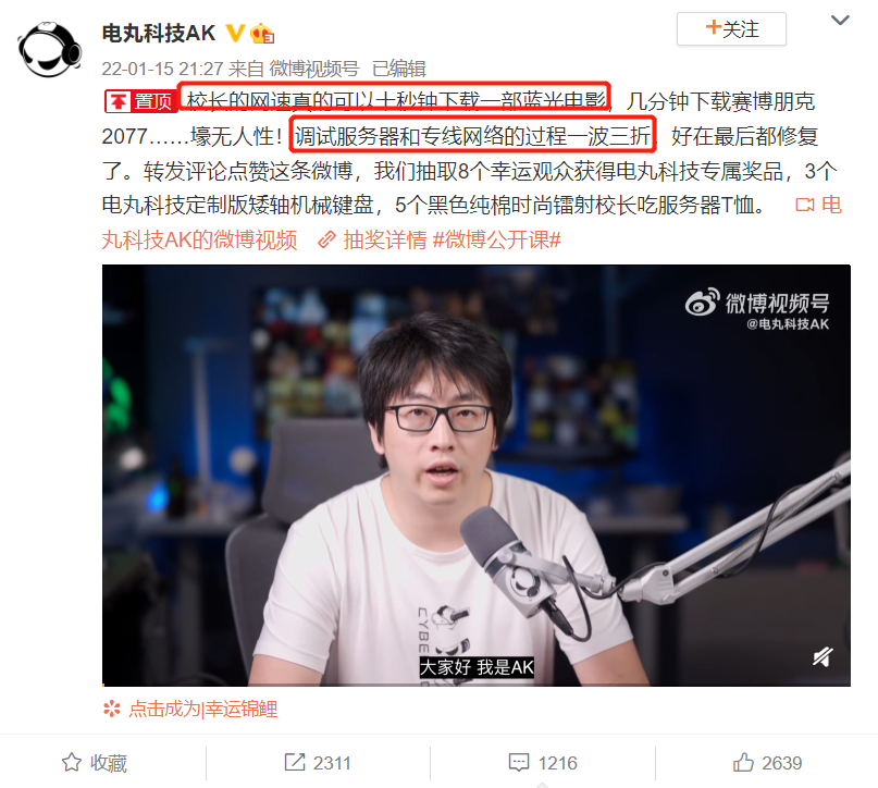 1月15号,@电丸科技AK更新视频,说了思聪哥的网线细节。