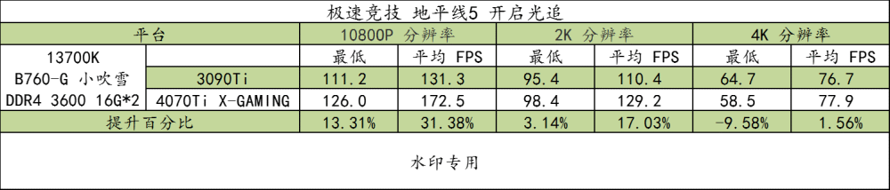 ▲ 极速竞技 地平线5 开启光追实测,在 2K 分辨率 与 1080P 分辨率,4070Ti X-GAMING 在整体游戏的平滑性、流畅性会表现更加出色,4K 分辨率下 4070Ti X-GAMING 还是挺吃优化的,竟然超越了老大哥 3090Ti。