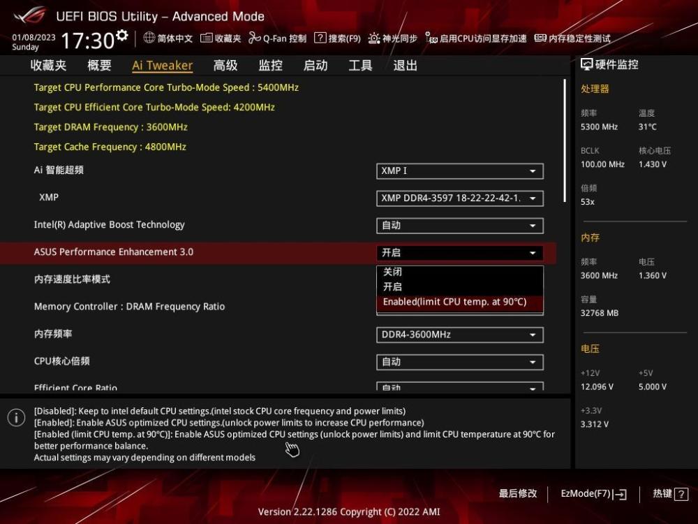▲ 进入高级模式下,开启“ASUS Performance Enhancement 3.0”功能,开启该功能可解锁处理器功耗,提供更强的处理器性能释放。