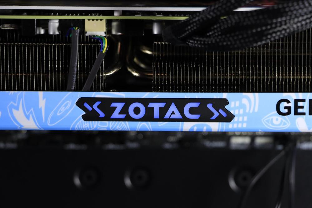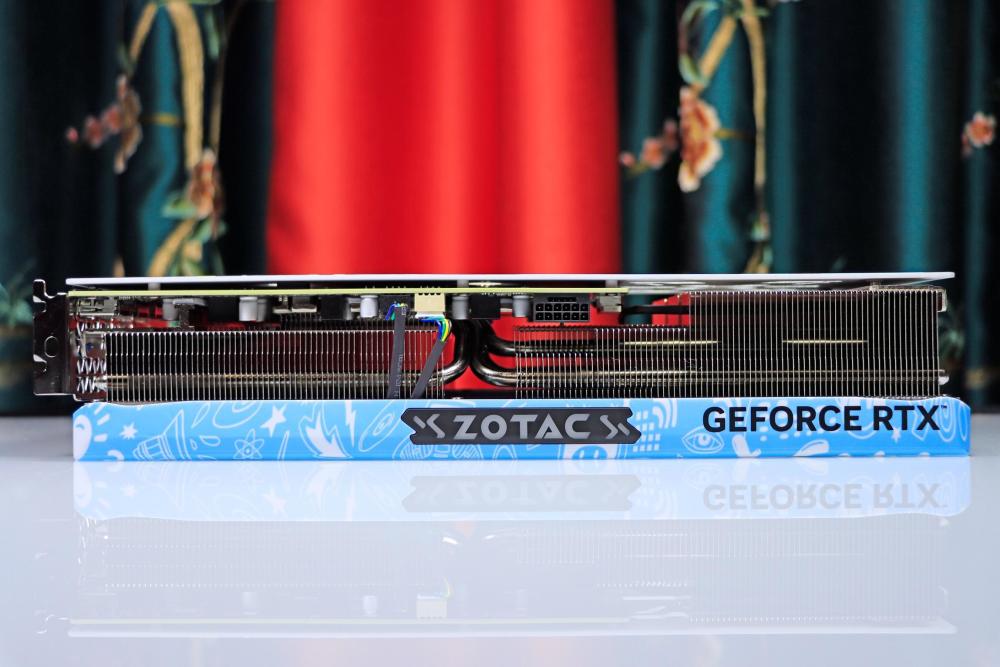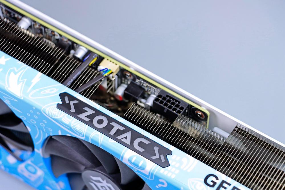 ▲ 显卡顶部正中有索泰的 LOGO 信仰灯,搭配 FireSstorm app ,可以支持 1600 万色自定义调节。16pin 12VHPWR 接口可以大幅度减少 PCB 尺寸,让显卡拥有更为顺畅的散热风道。