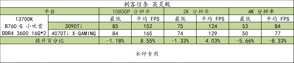 ▲ 刺客信条英灵殿实测,可以看到对于不是 4K 分辨率这种对于显存带宽有超大需求的场景,4070Ti X-GAMING 会有更好一点的表现。特别是 2K 分辨率下,会拥有非常出色的游戏流畅性。