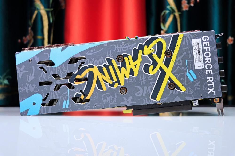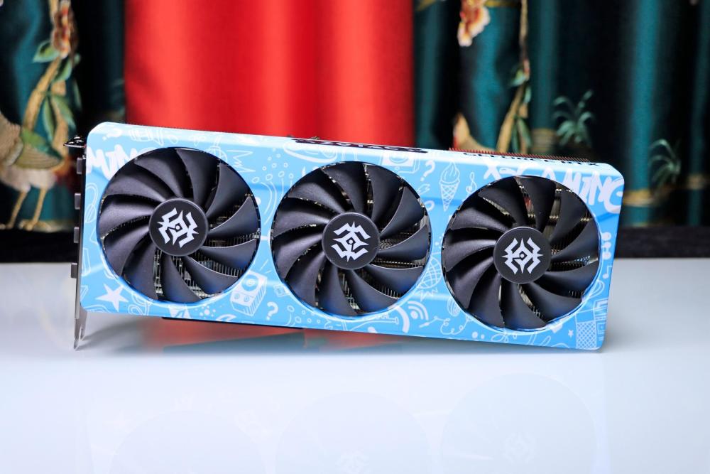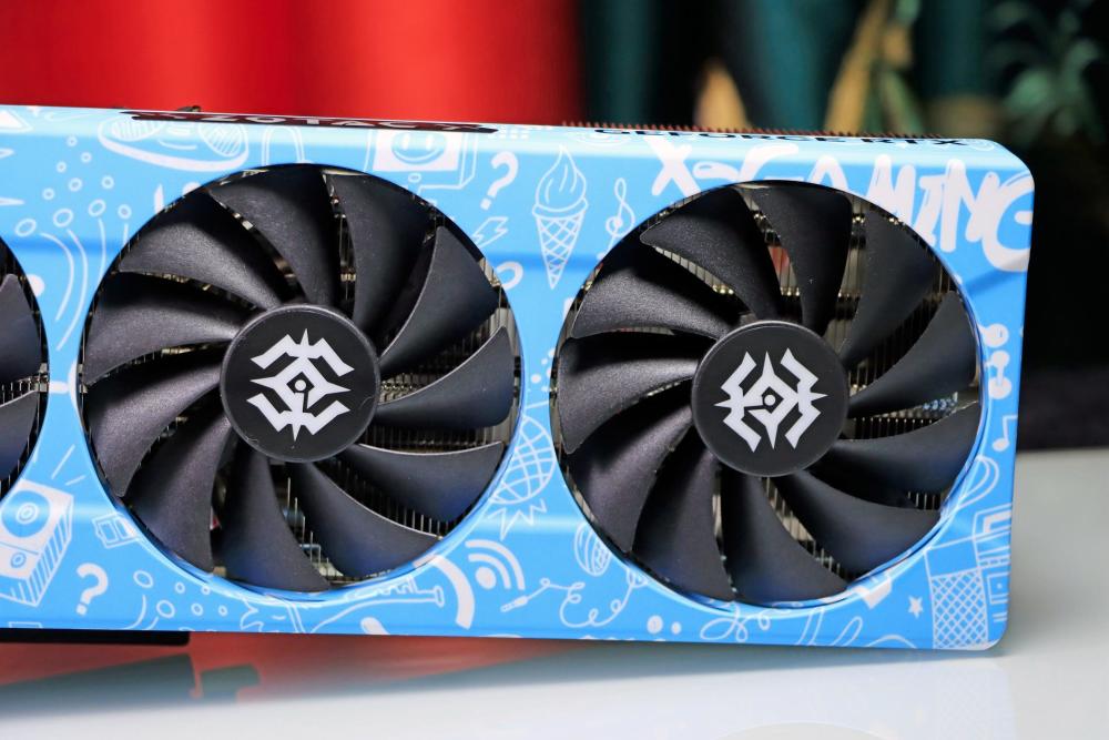 ▲ 索泰 RTX 4070Ti-12GB X-GAMING OC 的外观非常别致,青春气息扑面而来,显卡风扇导流罩外观为涂鸦设计风格,蓝色作为底色,白色的涂鸦充满小清新风格,又充满萌动童趣。