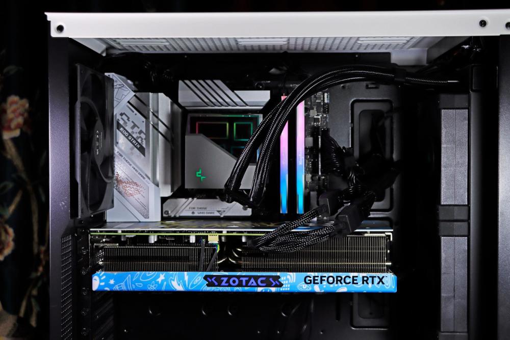 ▲ 装机完成后的样子,如果机箱内部全白的话,颜值会更为出色。CK500 幻城白的宽度十分出色,可以适配 40 系列显卡 + 12VHPWR 转接线的组合。