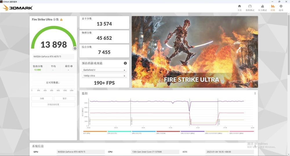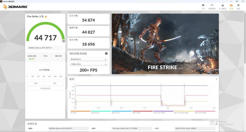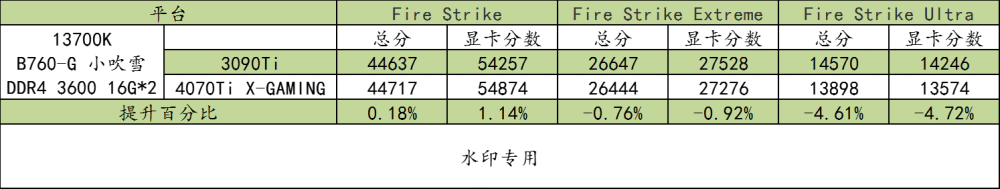 ▲ 索泰 4070Ti X-GAMING OC + 华硕 B760-G 小吹雪 D4 + 13700K 的 3Dmark Fire Strike 系列性能测试。