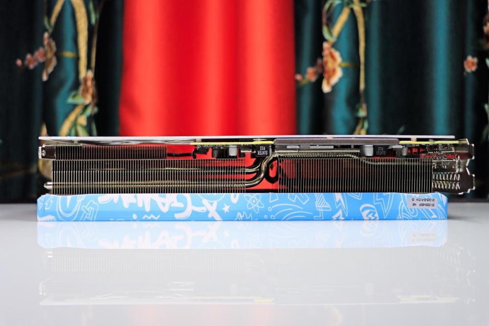 ▲ 从底部可以看到冰镜导热模组与 GPU 表面完美贴合,让 GPU 产生的热量快速散发出去,散热模组采用高导热率的硅脂与供电模块、显存连接,让热量更快速的从发热元件上传导到冰镜导热模组上,再通过出色的风道气流散发出去。