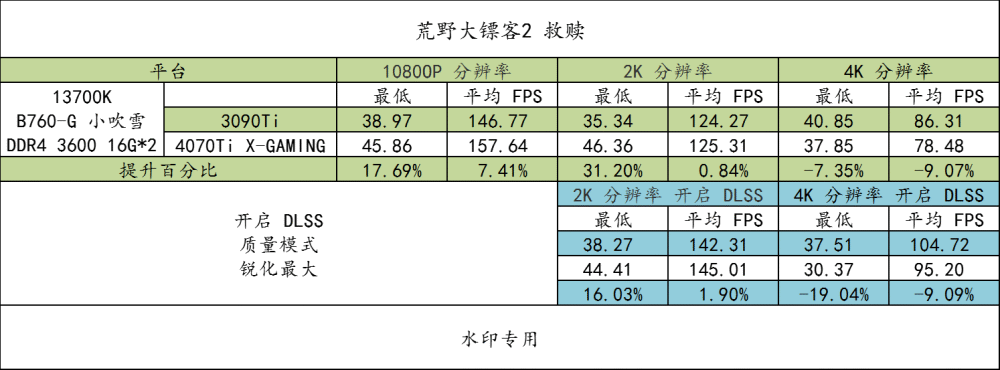 ▲ 荒野大镖客2 救赎 支持 NVIDIA DLSS,因此我们测试一共涉及 5 个类别。在不开启 DLSS,只开启最高特效下,4070Ti X-GAMING 在 2K 分辨率时略微领先 3090Ti,在 1080P 获得优势,在 4K 分辨率下全面输给 3090Ti。开启 DLSS 后,4070Ti X-GAMING 情况也是类似的,在 2K 分辨率时略微领先 3090Ti在 4K 分辨率下全面输给 3090Ti,而且最低帧输的幅度还在拉大。