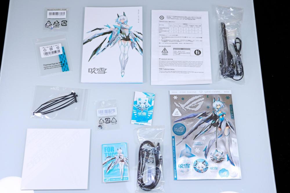 ▲ 丰富的配件包,其中有非常重要的无线网卡扩展天线,一定要装上哦,此外还有非常靓丽的 雪武战姬贴纸、周边、SATA 数据线,说明书,ROG 入会指南等。
