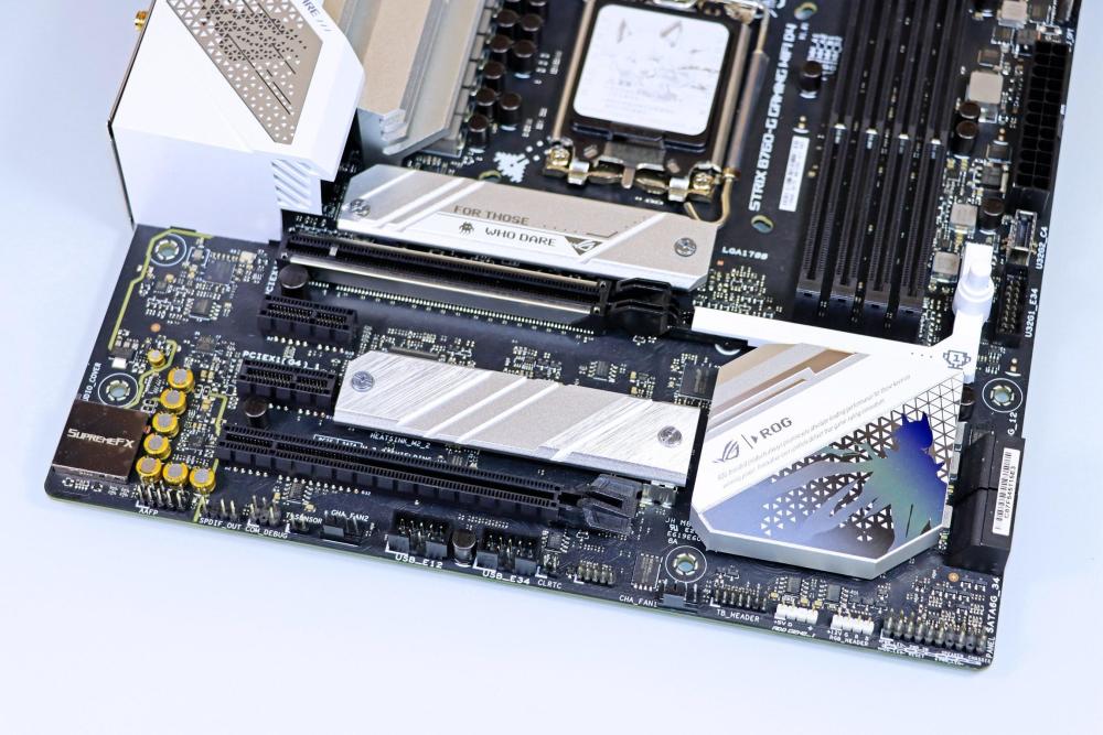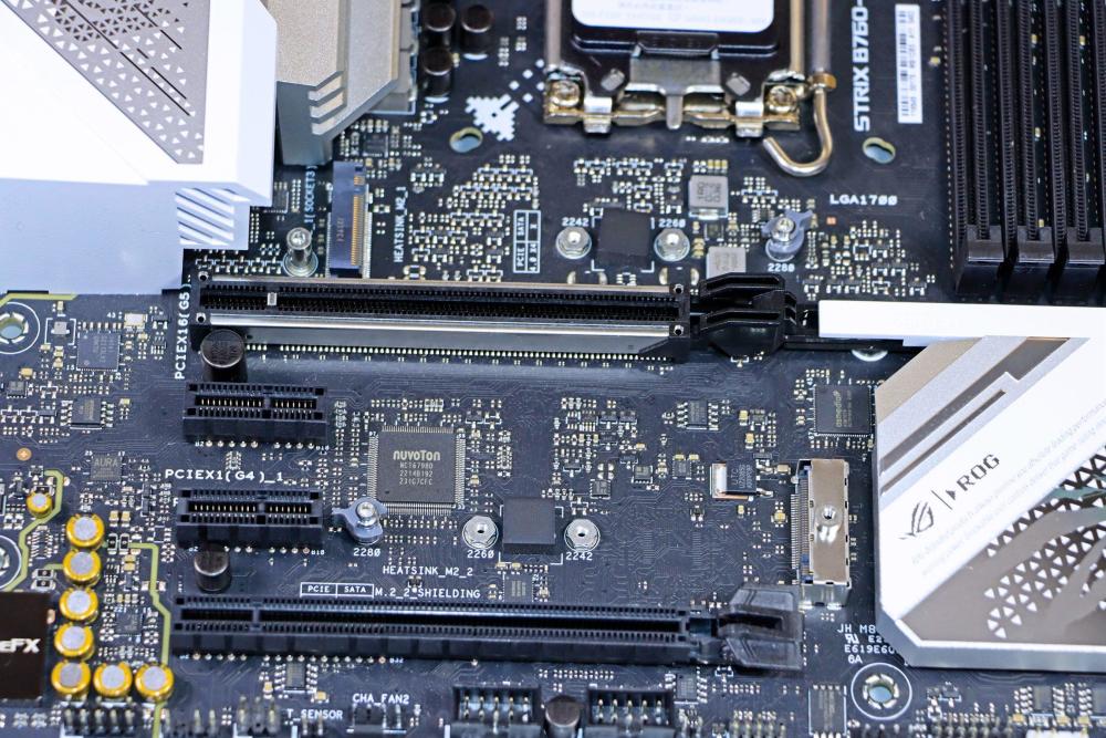 ▲ 主板的下半区域有两个 M.2 PCIe 4.0 X4 接口,靠近 CPU 的 M.2 接口为 CPU 直连,靠近 PCH 的为 PCH 扩展。主板的 PCIe 5.0 X16 显卡插槽有采用钢铁装甲加以加固,此外还有 PCH 扩展的 PCIe 4.0 X1 插槽两个,以及全尺寸的 PCIe 4.0 扩展插槽。